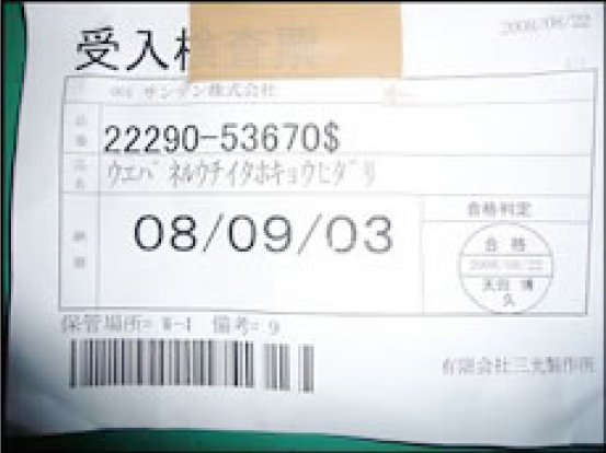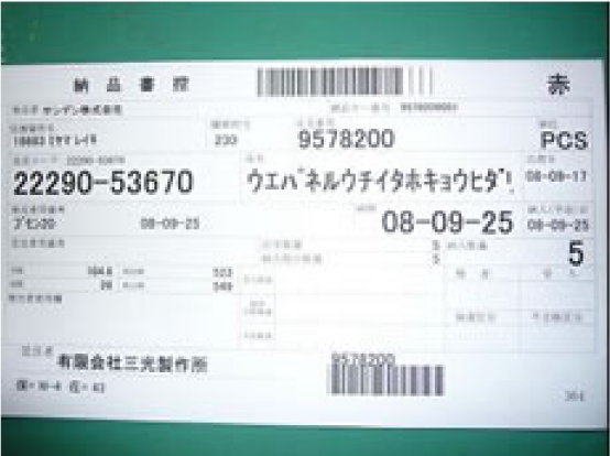 社内の品物にバーコード付の現品票を貼付。客先現品票及び納品書にあるバーコードとハンデイのバーコードリーダーを用いて品物の照合を行うとともに自社生産管理システムと連動させて、出荷管理、現品管理等を行います。既存の生産管理システムにバーコードを組み込むことで、工程の進捗状況と製造履歴情報がリアルタイムに把握可能となり、受注処理の管理向上にもつながっています。現品管理については精度が飛躍的に向上。製品の数え間違いが発生しても製造履歴情報をたどることで原因究明が可能となり、人的作業の負荷軽減による生産効率の向上を実現しております。